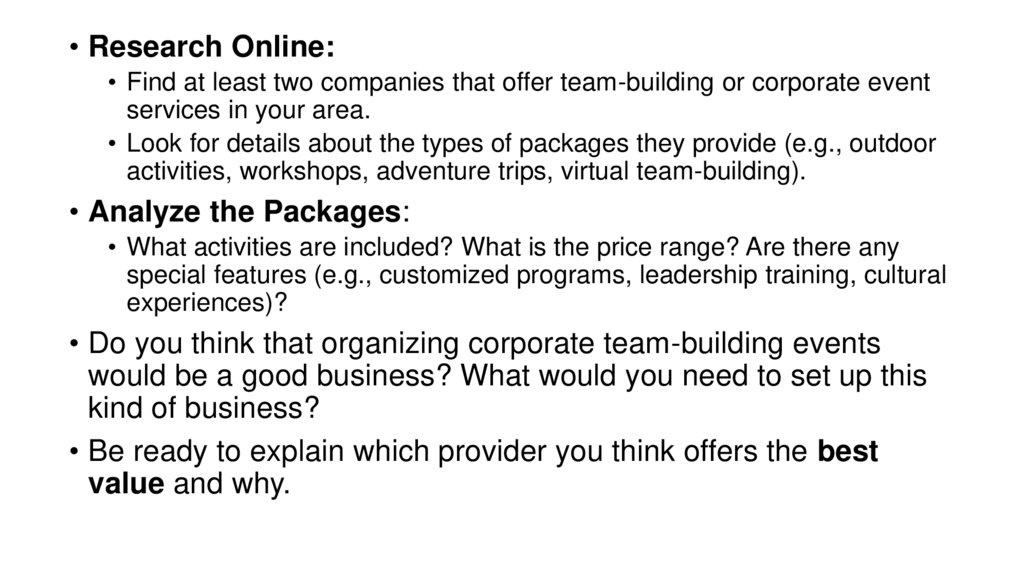 • Research Online:• Find at least two companies that offer team-building or corporate event