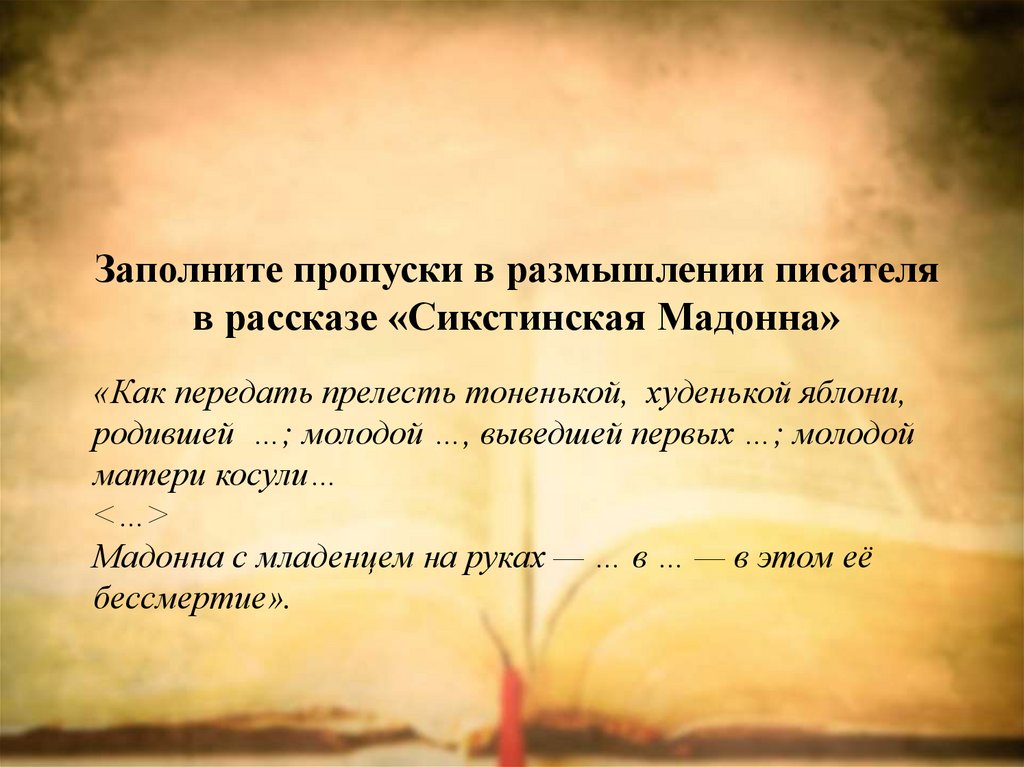 Заполните пропуски в размышлении писателяв рассказе «Сикстинская Мадонна»