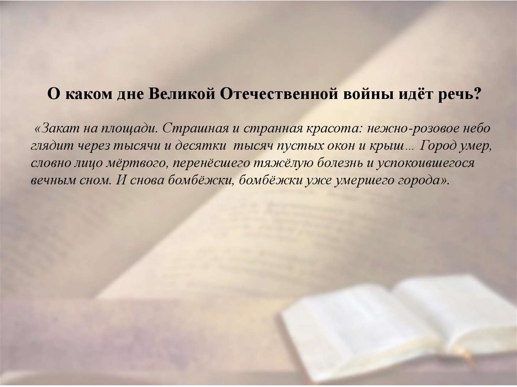 О каком дне Великой Отечественной войны идёт речь?«Закат на площади. Страшная и странная красота: нежно-розовое небо