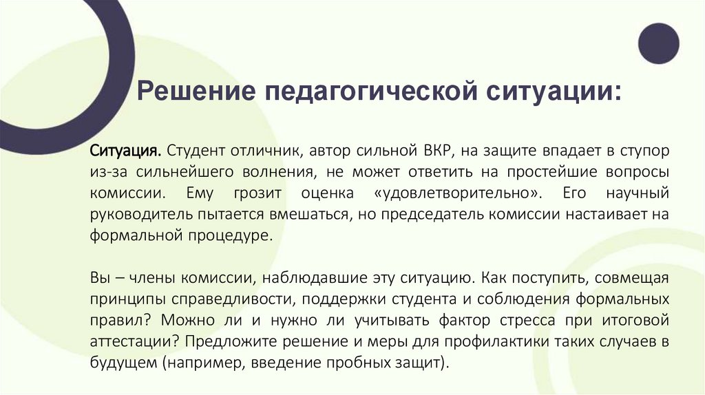 Решение педагогической ситуации:Ситуация. Студент отличник, автор сильной ВКР, на защите впадает в ступор