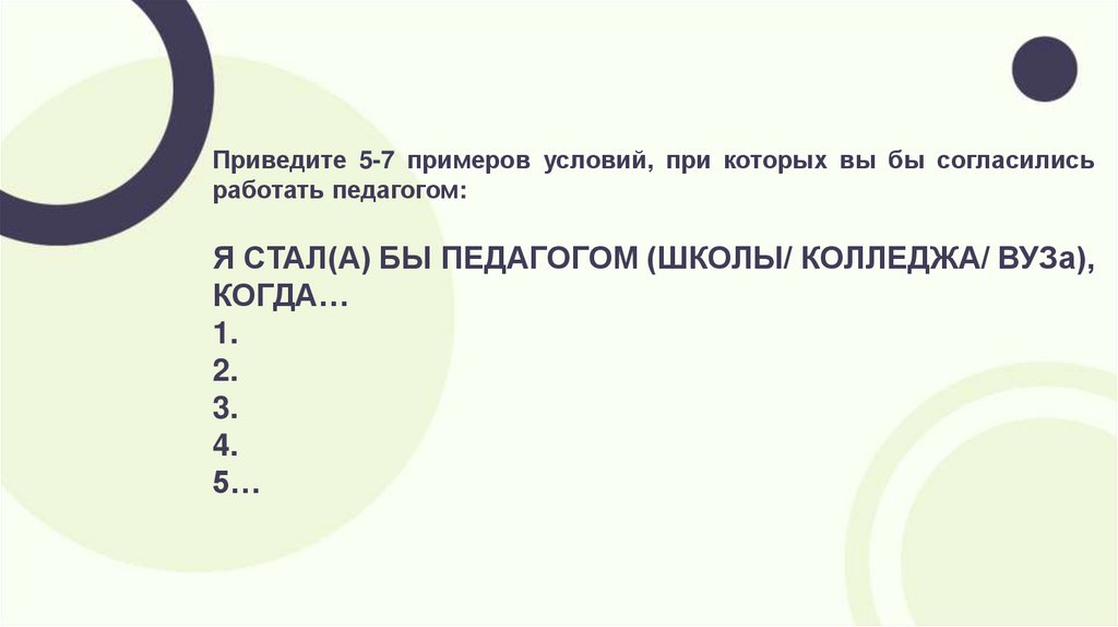 Приведите 5-7 примеров условий, при которых вы бы согласилисьработать педагогом: