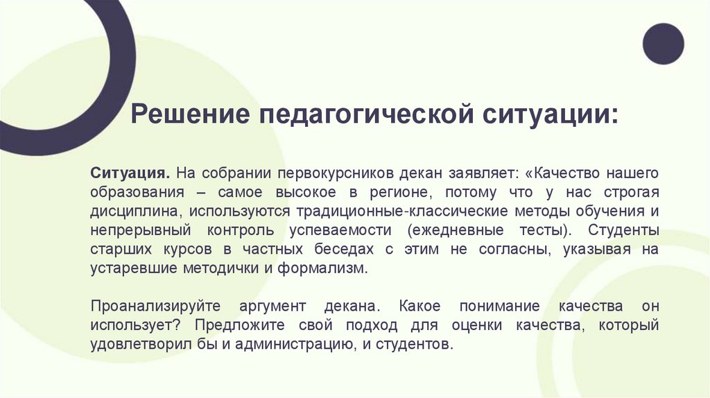 Решение педагогической ситуации:Ситуация. На собрании первокурсников декан заявляет: «Качество нашего