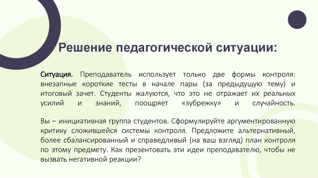 Решение педагогической ситуации:Ситуация. Преподаватель использует только две формы контроля: