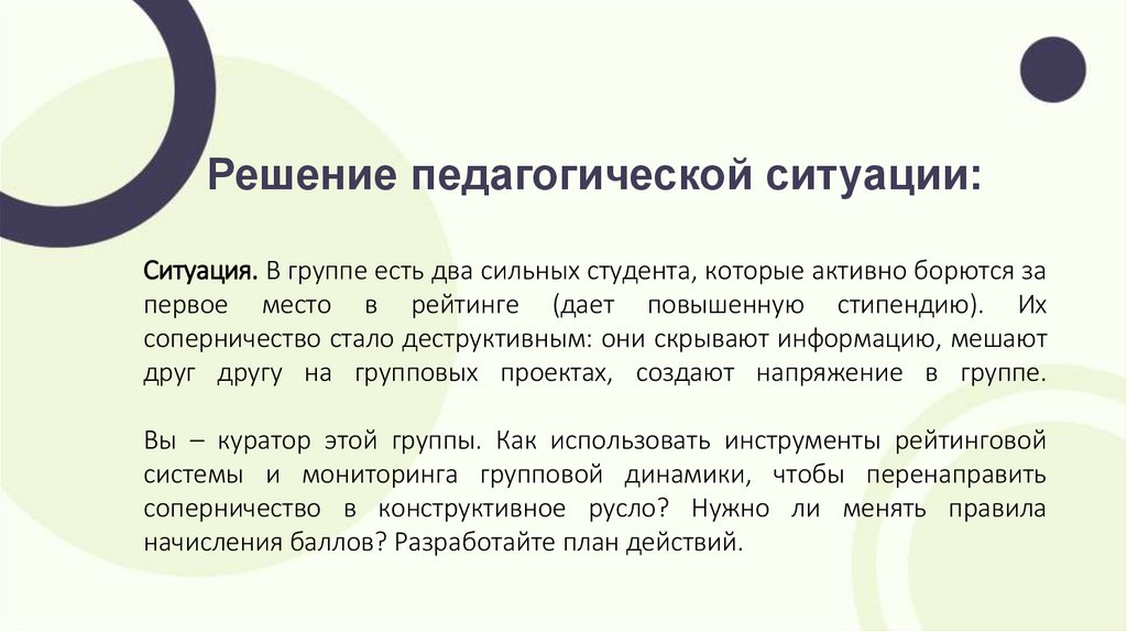 Решение педагогической ситуации:Ситуация. В группе есть два сильных студента, которые активно борются за