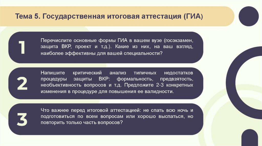 Тема 5. Государственная итоговая аттестация (ГИА)Перечислите основные формы ГИА в вашем вузе (госэкзамен,
