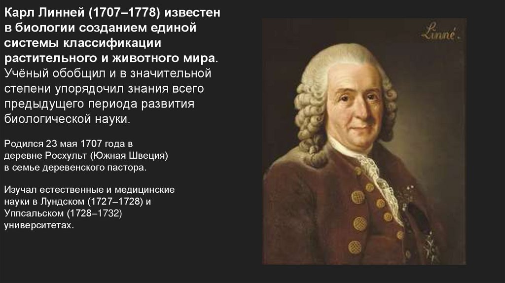 Карл Линней (1707–1778) известенв биологии созданием единой