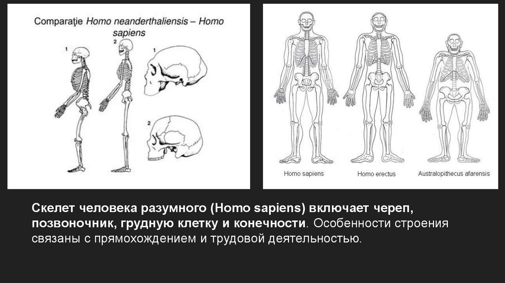 Скелет человека разумного (Homo sapiens) включает череп,позвоночник, грудную клетку и конечности. Особенности строения