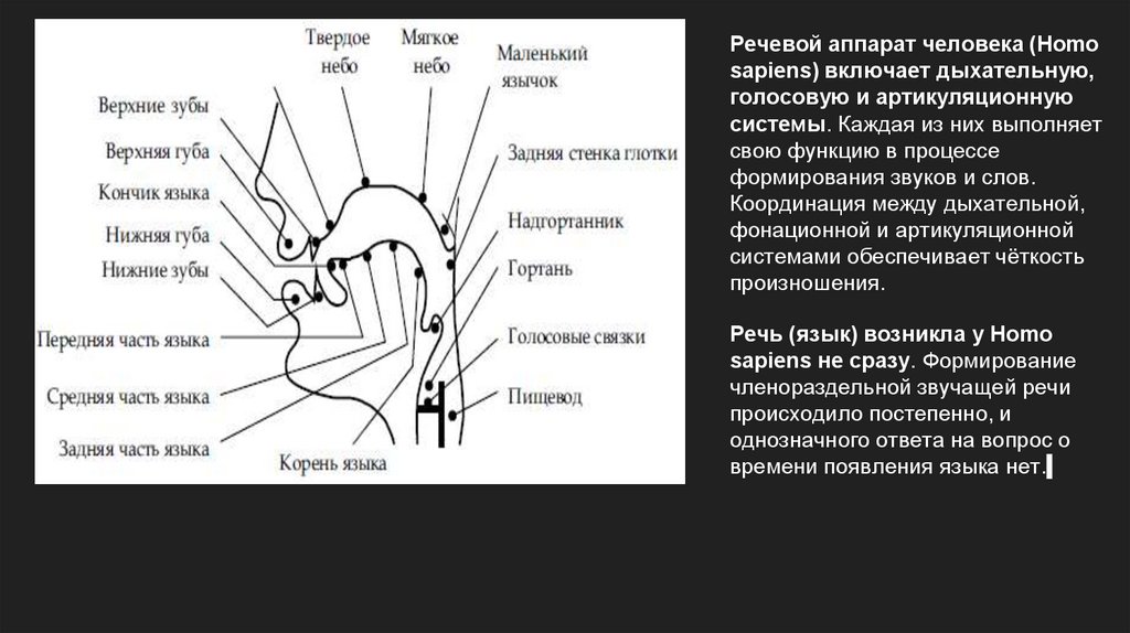 Речевой аппарат человека (Homosapiens) включает дыхательную,
