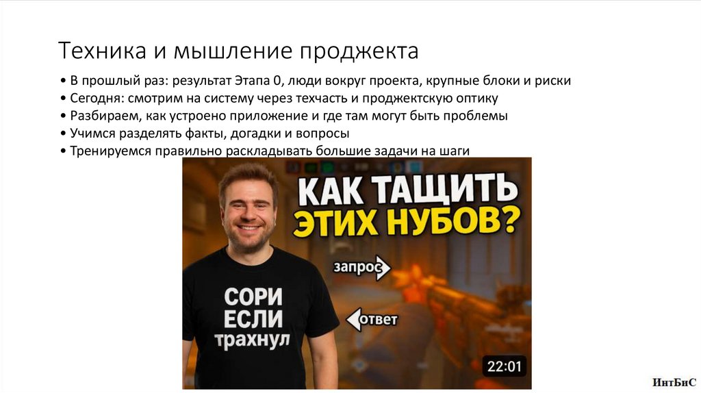 • В прошлый раз: результат Этапа 0, люди вокруг проекта, крупные блоки и риски• Сегодня: смотрим на систему через техчасть и проджектскую оптику