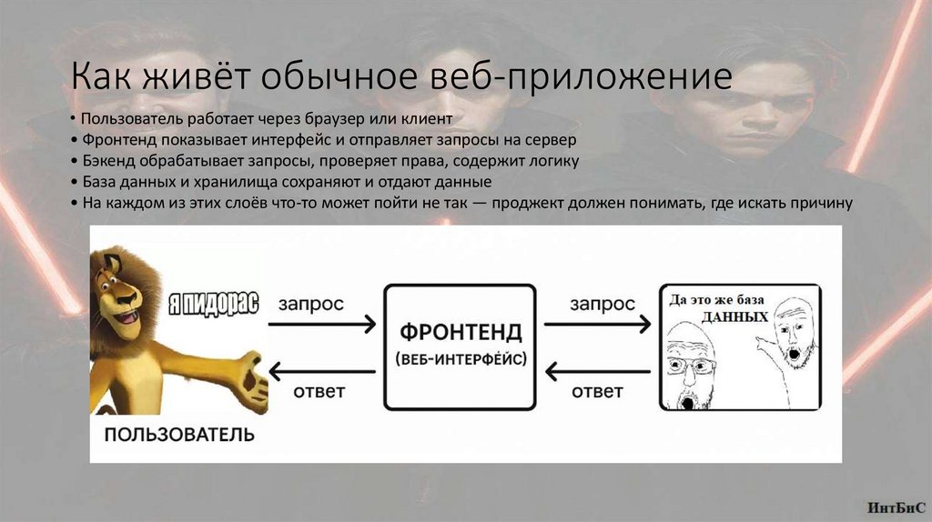 • Бэкенд обрабатывает запросы, проверяет права, содержит логику