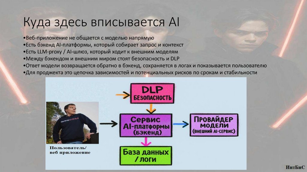 •Веб-приложение не общается с моделью напрямую•Есть бэкенд AI-платформы, который собирает запрос и контекст