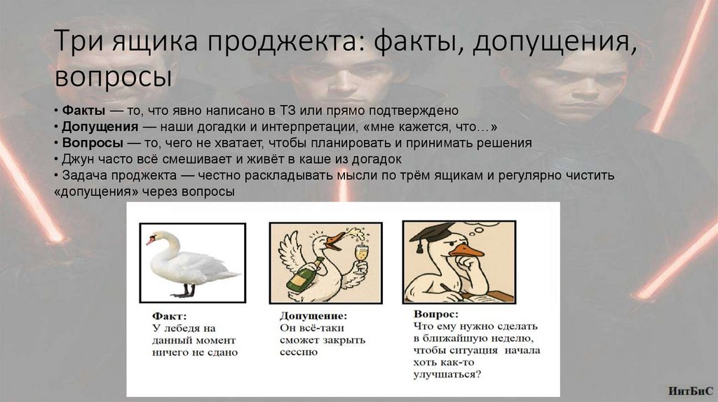 • Задача проджекта — честно раскладывать мысли по трём ящикам и регулярно чистить