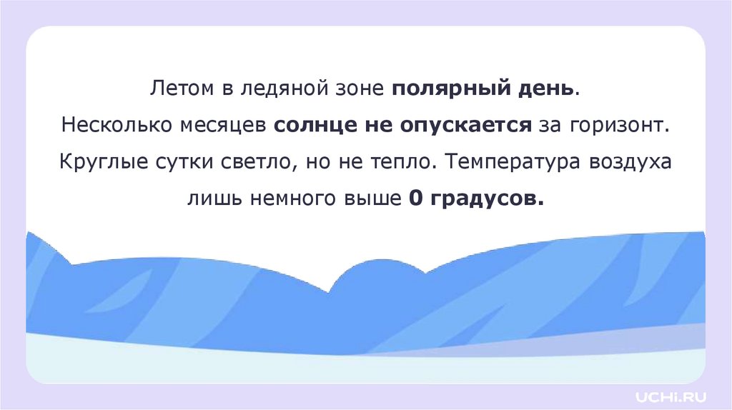 Летом в ледяной зоне полярный день.Несколько месяцев солнце не опускается за горизонт.