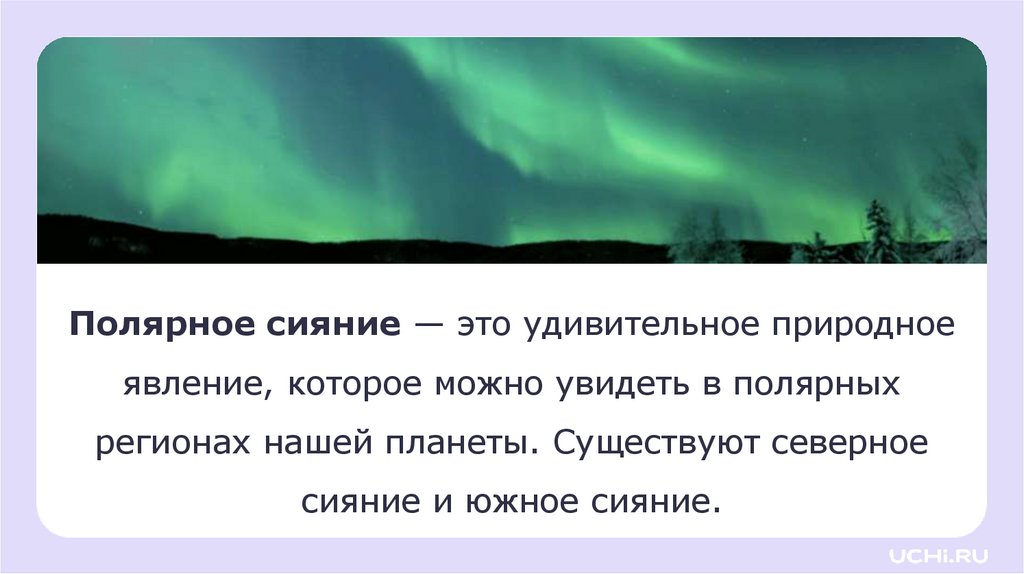 Полярное сияние — это удивительное природноеявление, которое можно увидеть в полярных