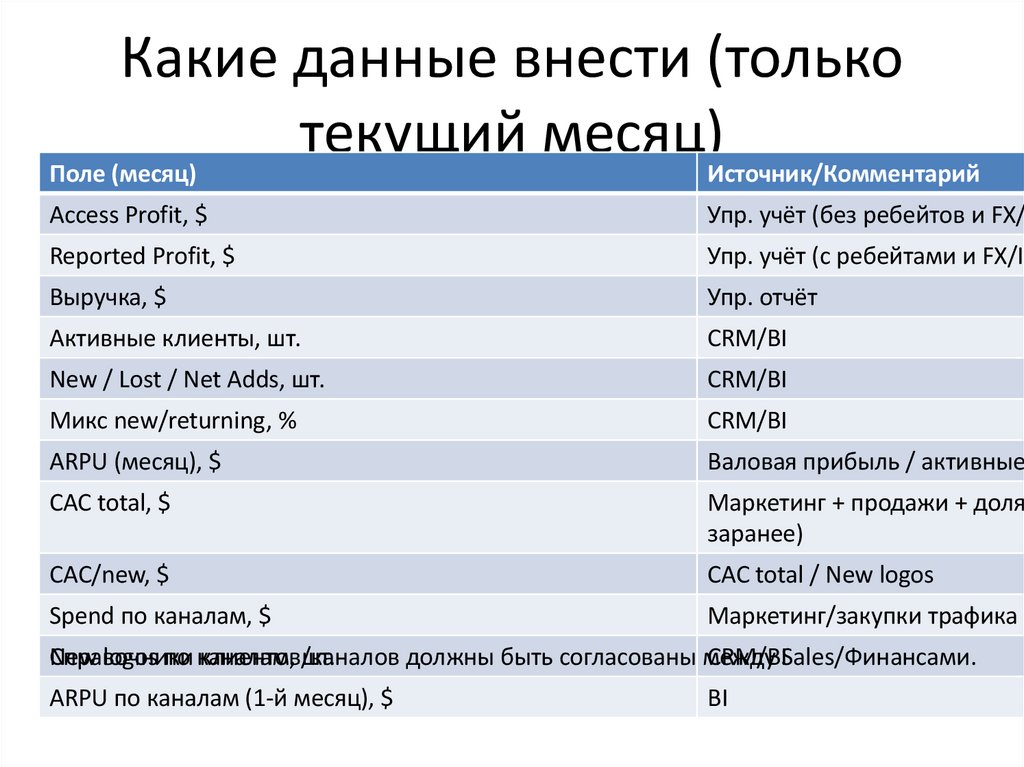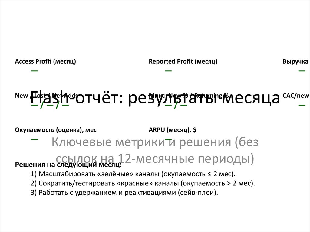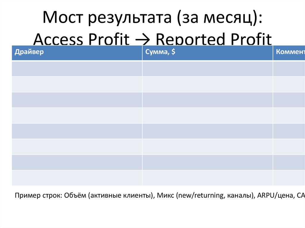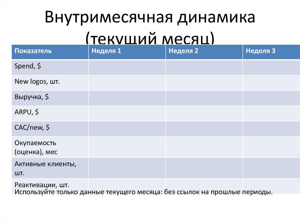 Пример строк: Объём (активные клиенты), Микс (new/returning, каналы), ARPU/цена, CAC