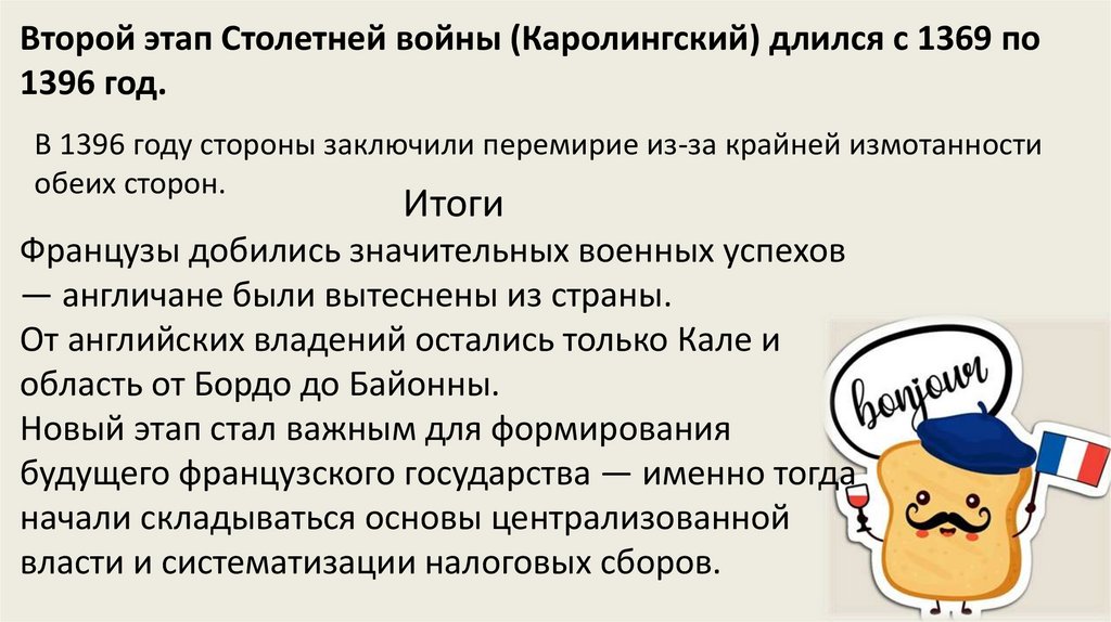 Второй этап Столетней войны (Каролингский) длился с 1369 по1396 год.