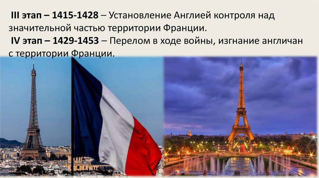 III этап – 1415-1428 – Установление Англией контроля надзначительной частью территории Франции.