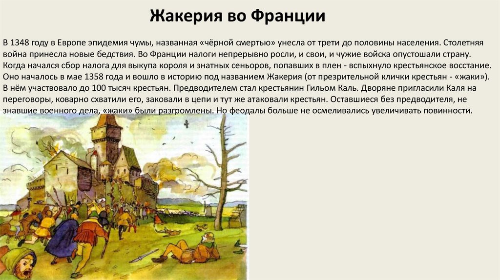 Жакерия во ФранцииВ 1348 году в Европе эпидемия чумы, названная «чёрной смертью» унесла от трети до половины населения. Столетняя
