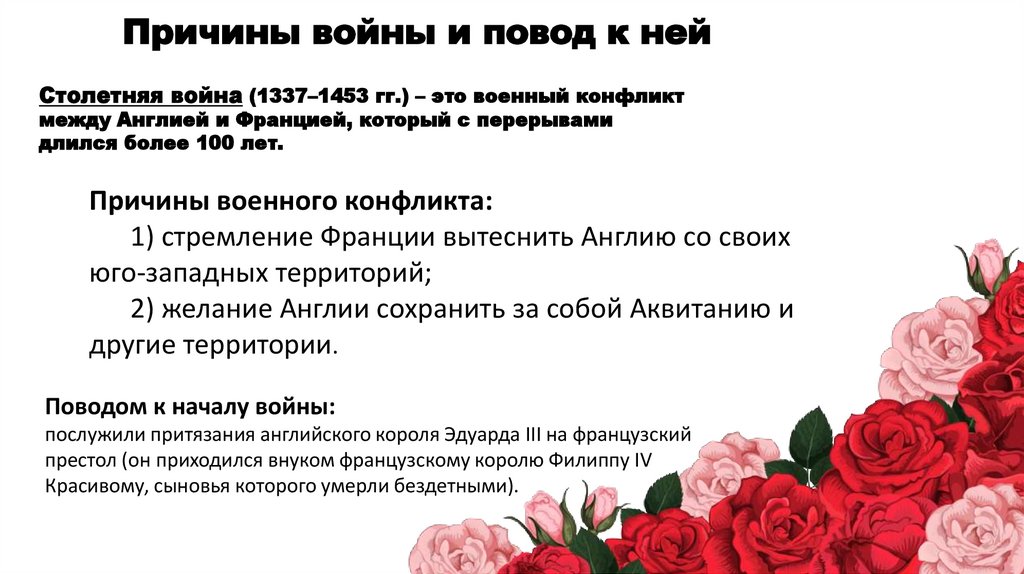 Причины войны и повод к нейСтолетняя война (1337–1453 гг.) – это военный конфликт