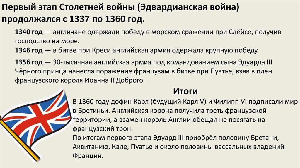Первый этап Столетней войны (Эдвардианская война)продолжался с 1337 по 1360 год.