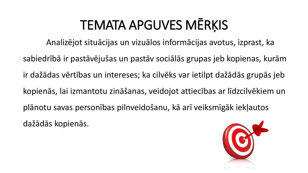 Analizējot situācijas un vizuālos informācijas avotus, izprast, kasabiedrībā ir pastāvējušas un pastāv sociālās grupas jeb kopienas, kurām