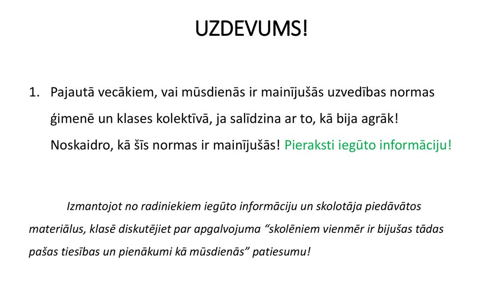 1. Pajautā vecākiem, vai mūsdienās ir mainījušās uzvedības normasģimenē un klases kolektīvā, ja salīdzina ar to, kā bija agrāk!