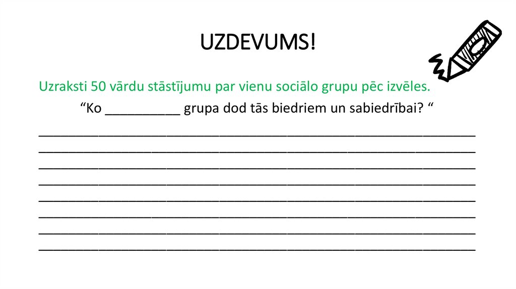 Uzraksti 50 vārdu stāstījumu par vienu sociālo grupu pēc izvēles.“Ko __________ grupa dod tās biedriem un sabiedrībai? “