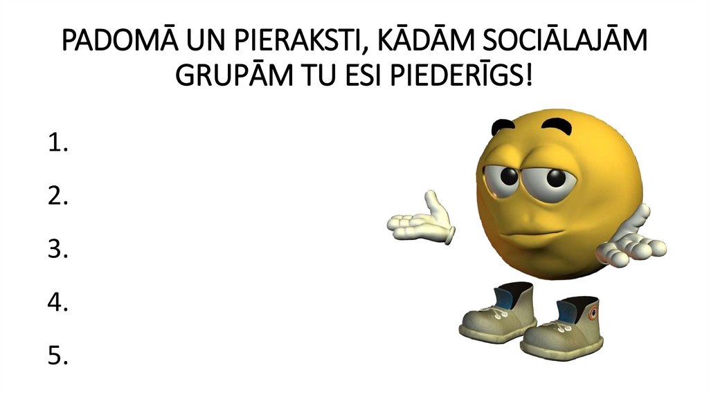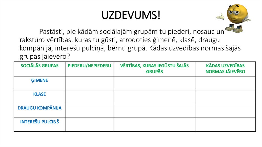 Pastāsti, pie kādām sociālajām grupām tu piederi, nosauc unraksturo vērtības, kuras tu gūsti, atrodoties ģimenē, klasē, draugu