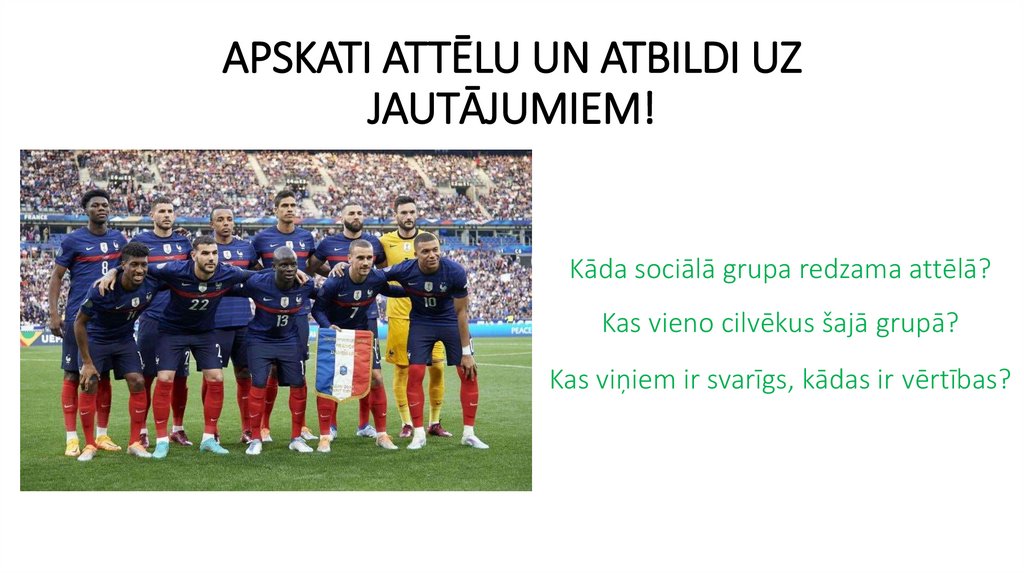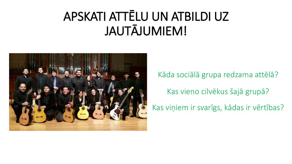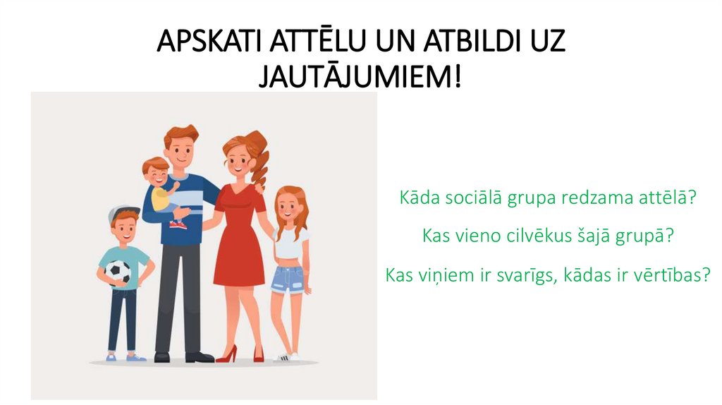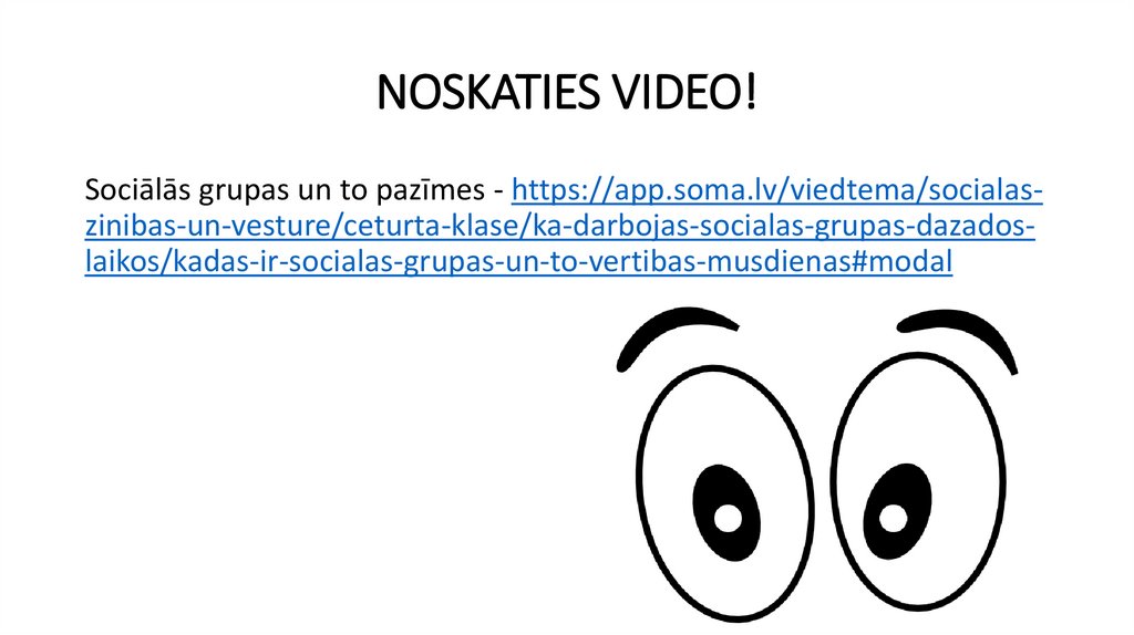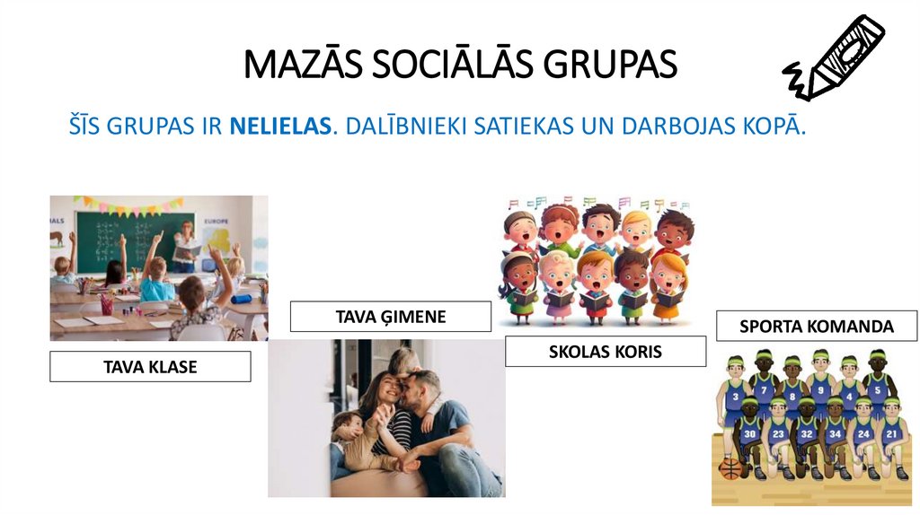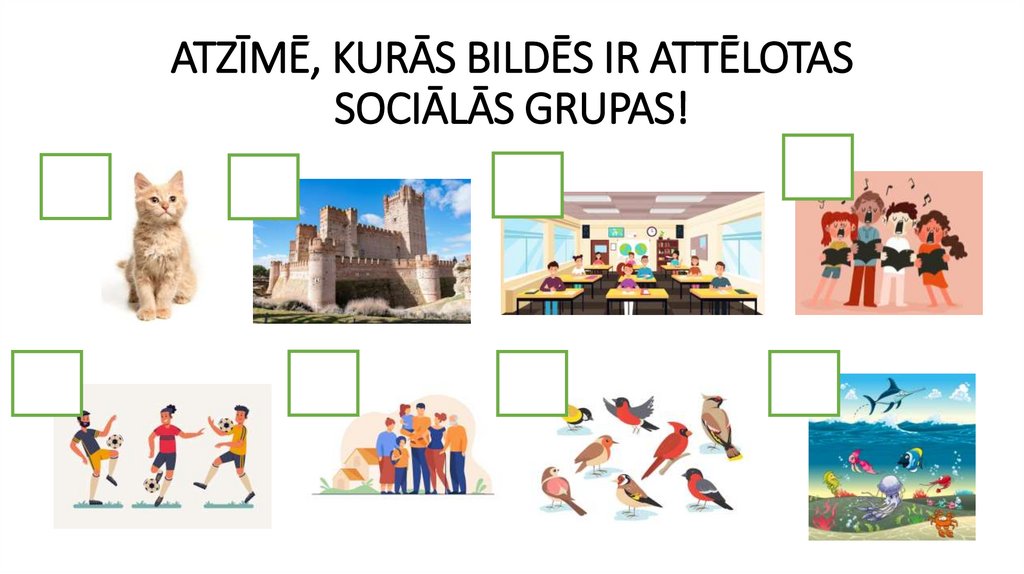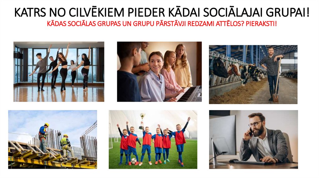 Sociālās grupas un to pazīmes - https://app.soma.lv/viedtema/socialaszinibas-un-vesture/ceturta-klase/ka-darbojas-socialas-grupas-dazadoslaikos/kadas-ir-socialas-grupas-un-to-vertibas-musdienas#modal10. ATZĪMĒ, KURĀS BILDĒS IR ATTĒLOTAS SOCIĀLĀS GRUPAS!