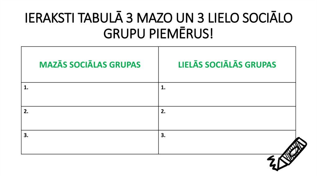 16. IERAKSTI TABULĀ 3 MAZO UN 3 LIELO SOCIĀLO GRUPU PIEMĒRUS!