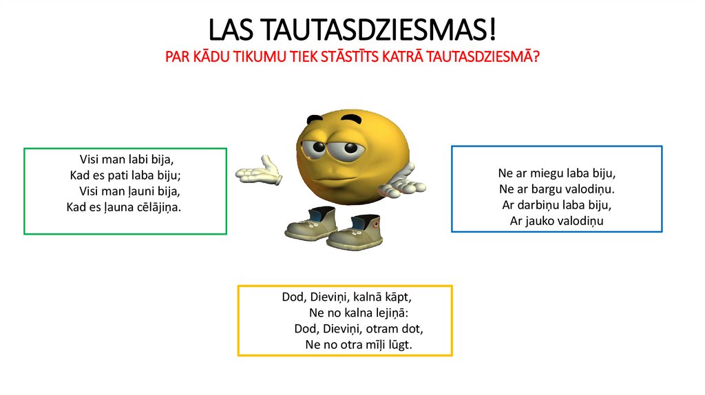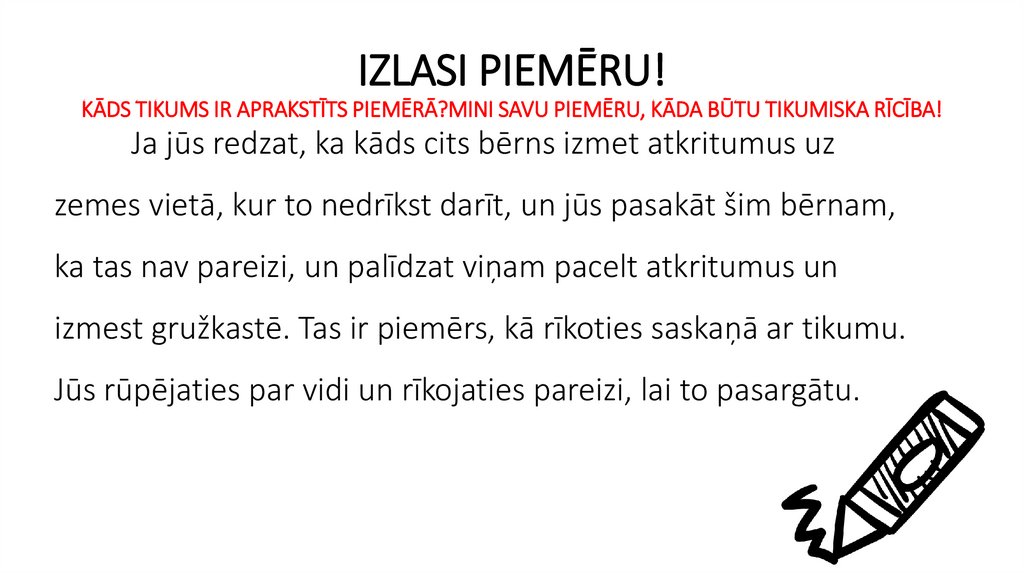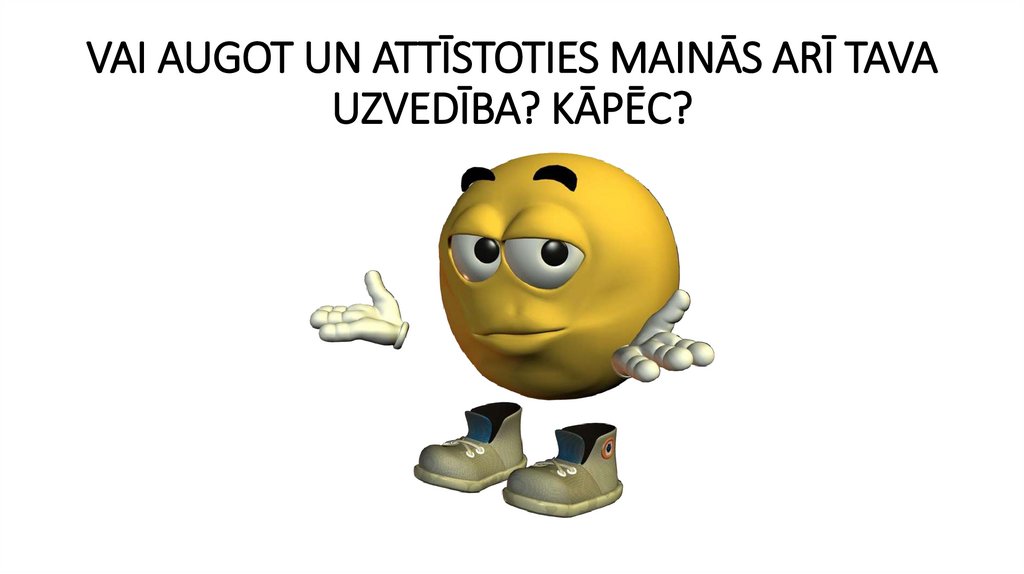 1. S.6.1.1. Paskaidro, kā paša domas un emocijas, arī augot un attīstoties, ietekmē uzvedību.Nosauc, kādas vērtības, tikumi un ieradumi ir paša rīcības pamatā. Pauž emocijas atbilstoši