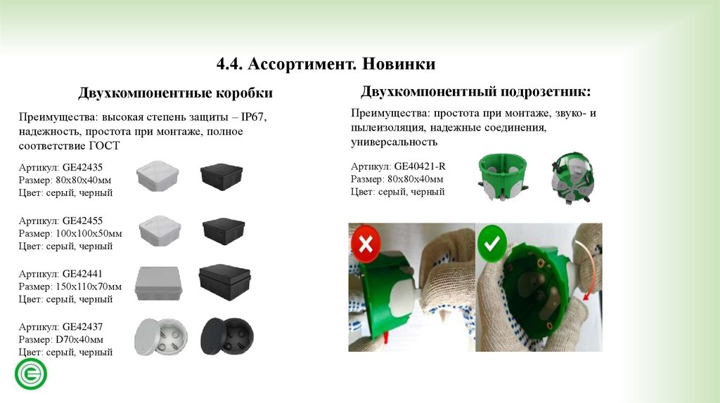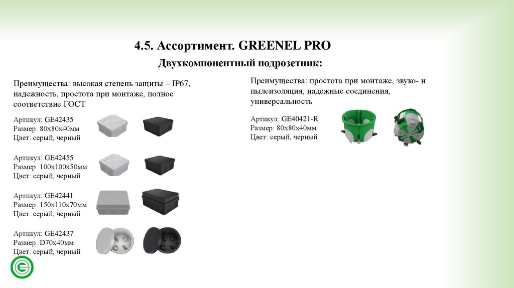 4.5. Ассортимент. GREENEL PROДвухкомпонентный подрозетник:
