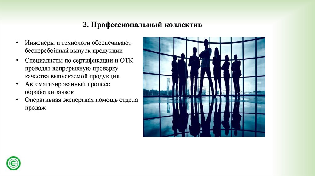 3. Профессиональный коллектив• Инженеры и технологи обеспечивают