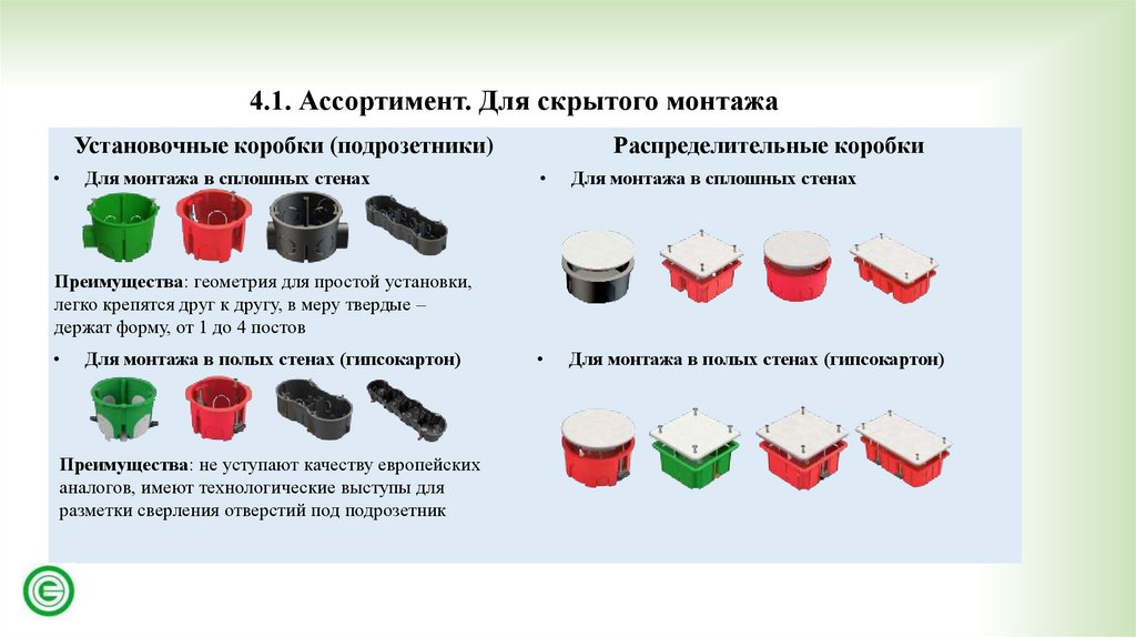4.1. Ассортимент. Для скрытого монтажаУстановочные коробки (подрозетники)