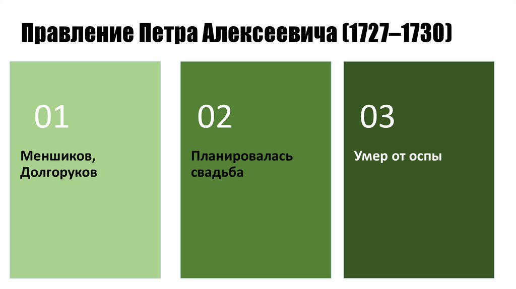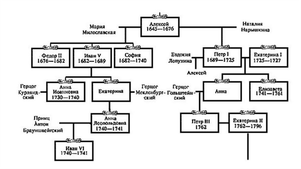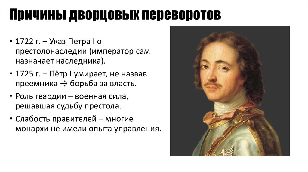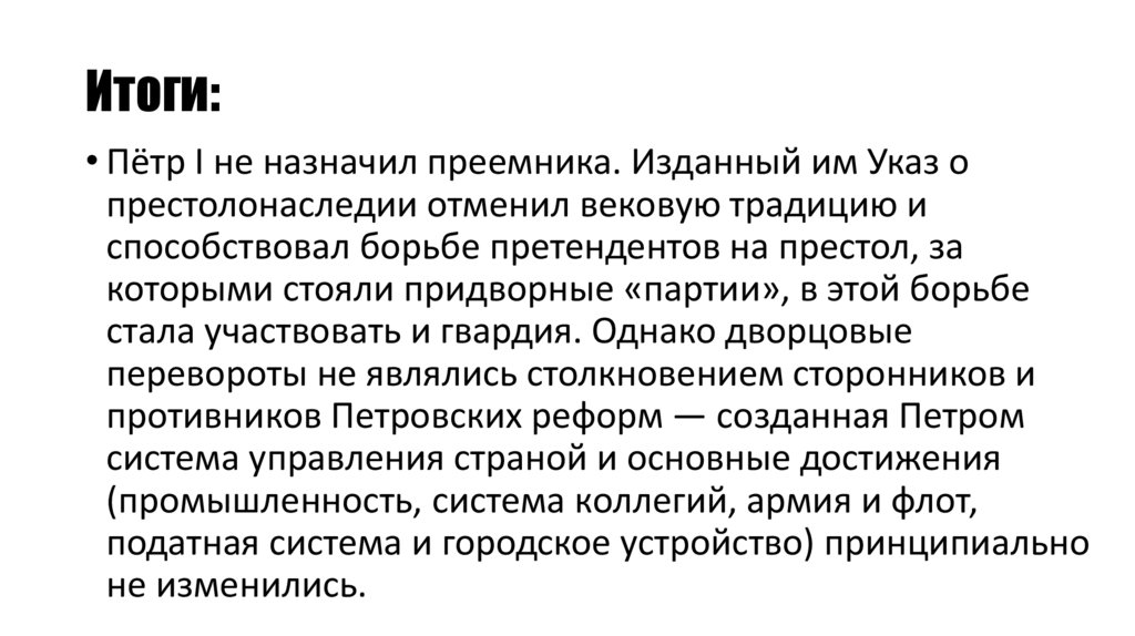 • Пётр I не назначил преемника. Изданный им Указ опрестолонаследии отменил вековую традицию и