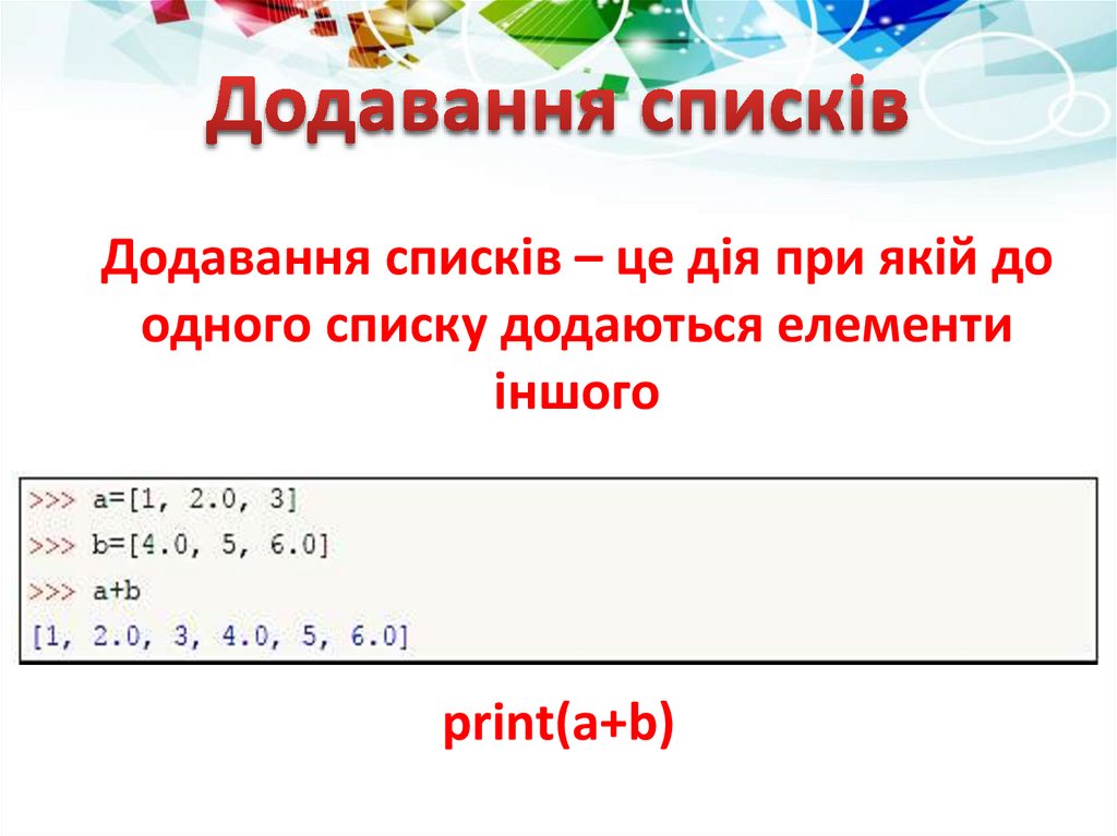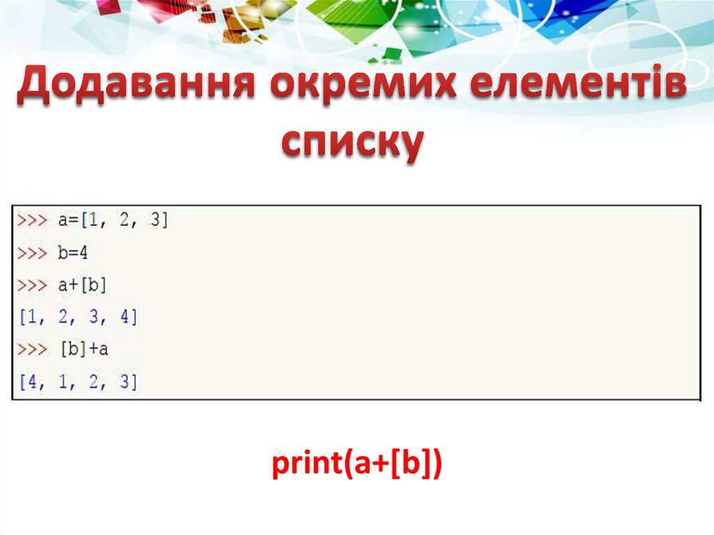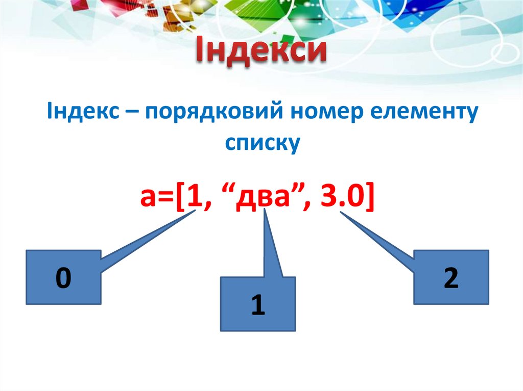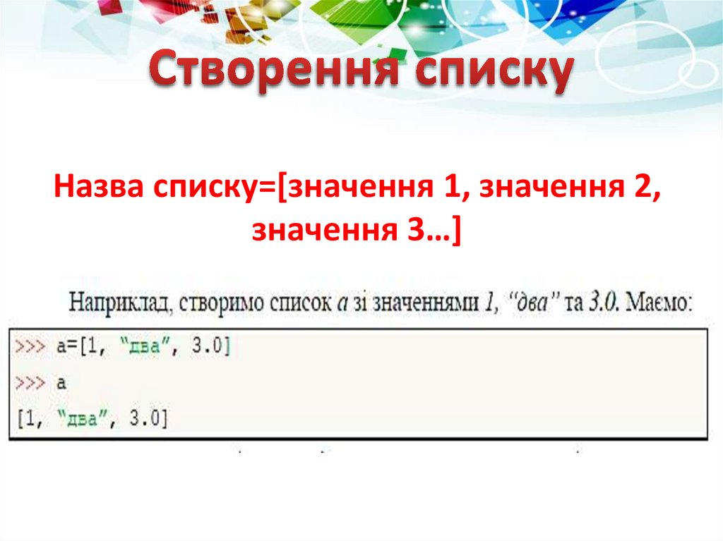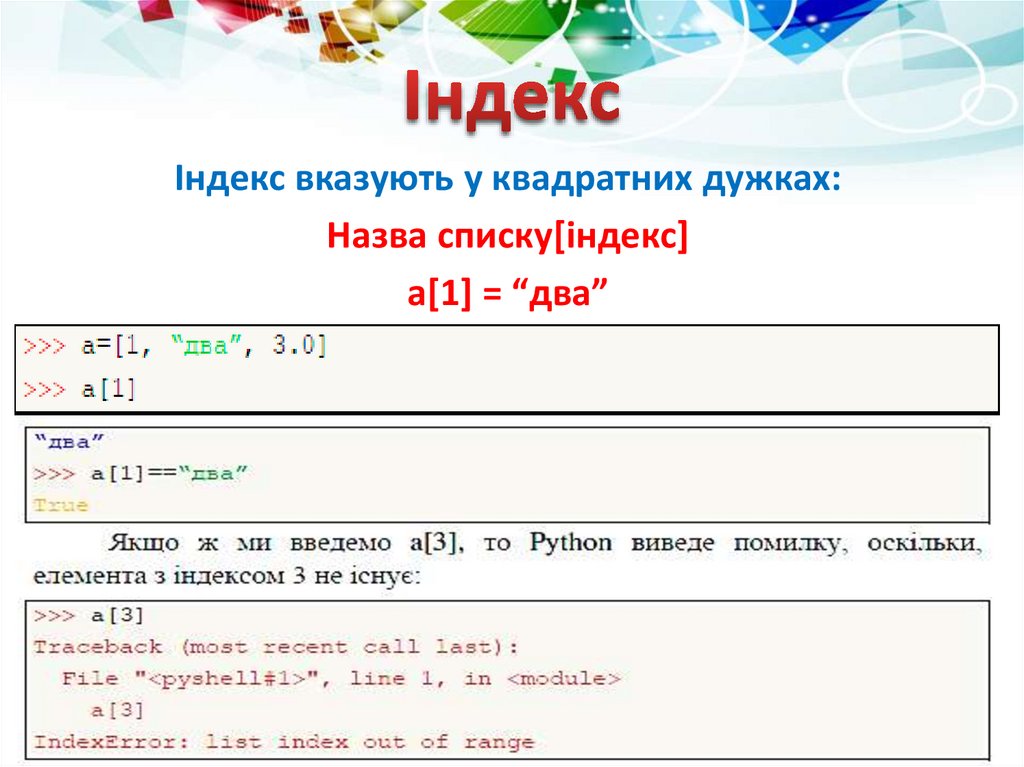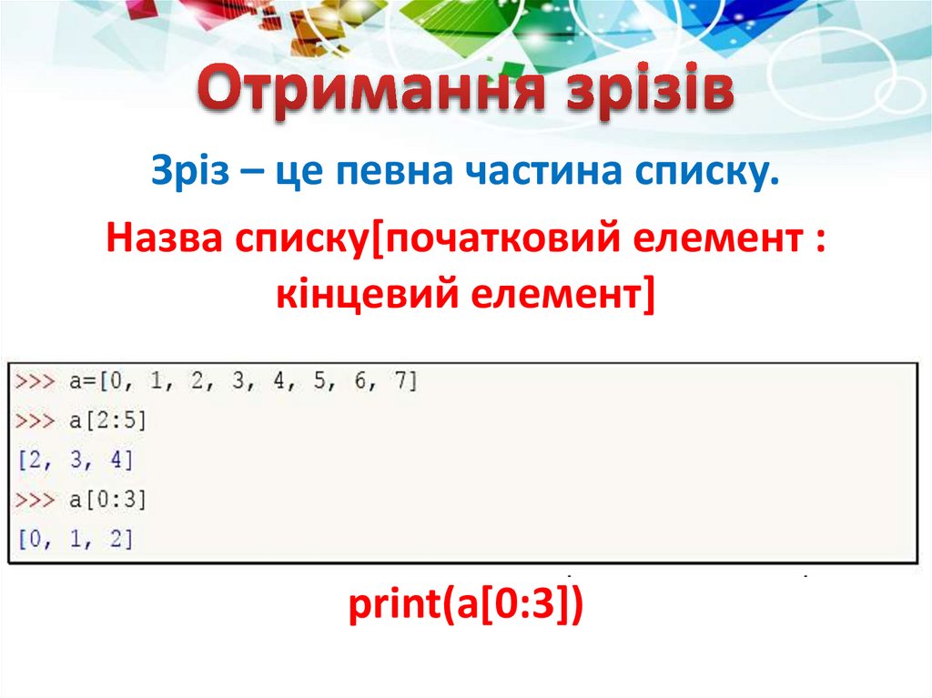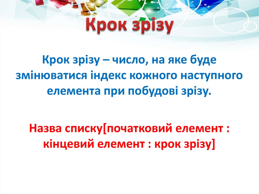Зріз – це певна частина списку.Назва списку[початковий елемент :