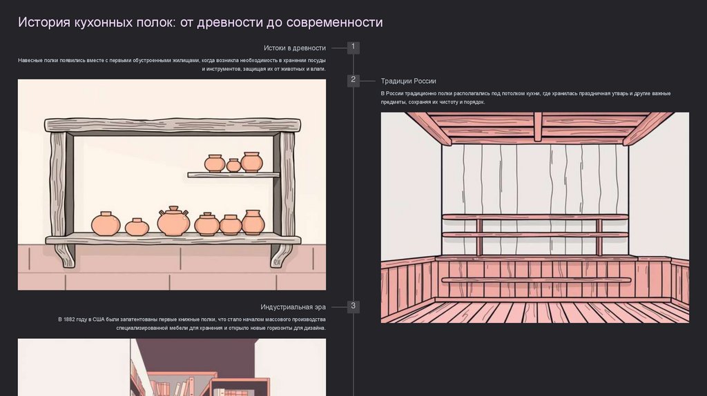Навесные полки появились вместе с первыми обустроенными жилищами, когда возникла необходимость в хранении посуды