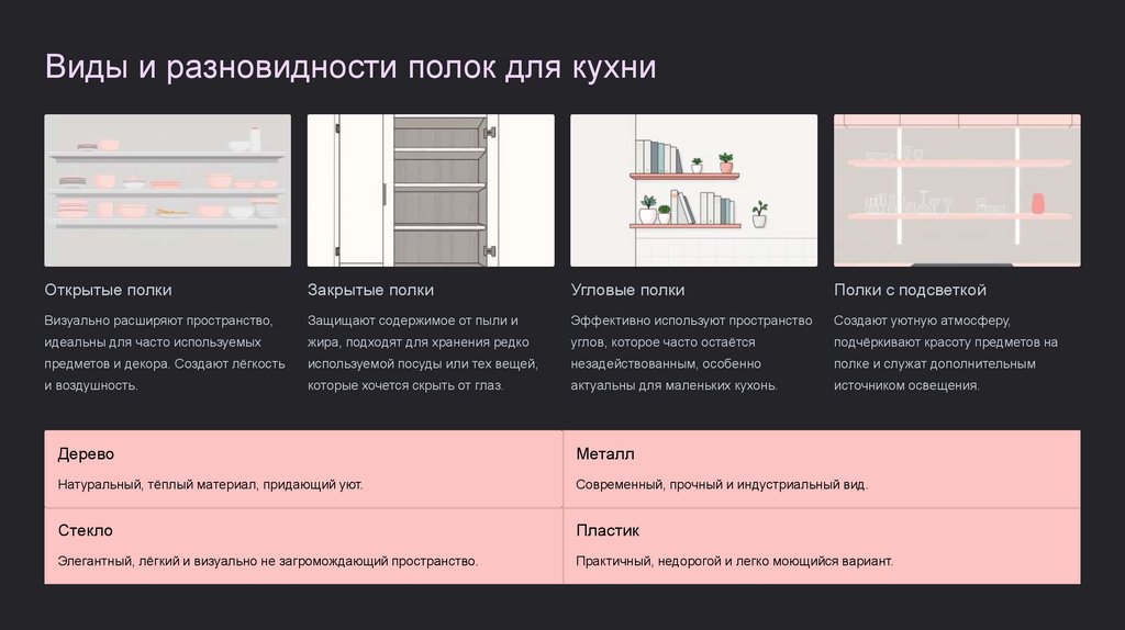 Подберите материал (дерево, металл, стекло, пластик), исходя из общего стиля кухни и функциональных требований к полке.