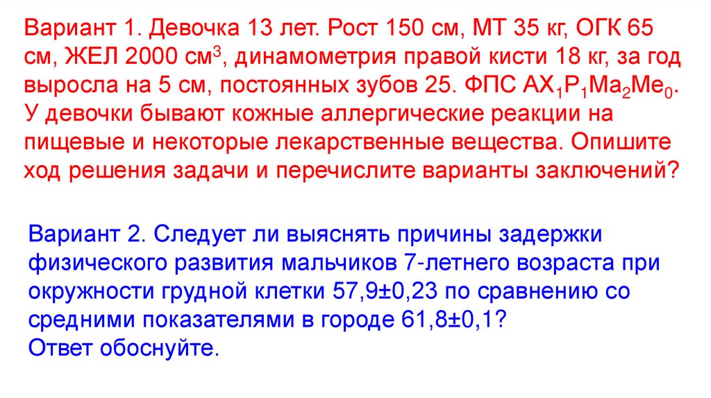 Вариант 1. Девочка 13 лет. Рост 150 см, МТ 35 кг, ОГК 65см, ЖЕЛ 2000 см3, динамометрия правой кисти 18 кг, за год