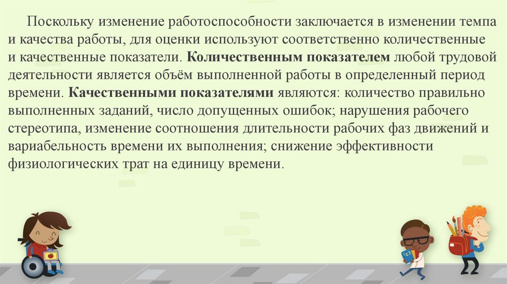 Поскольку изменение работоспособности заключается в изменении темпаи качества работы, для оценки используют соответственно количественные