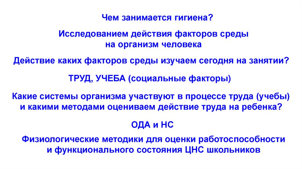 Чем занимается гигиена?Исследованием действия факторов среды