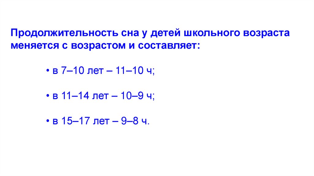 Продолжительность сна у детей школьного возрастаменяется с возрастом и составляет: