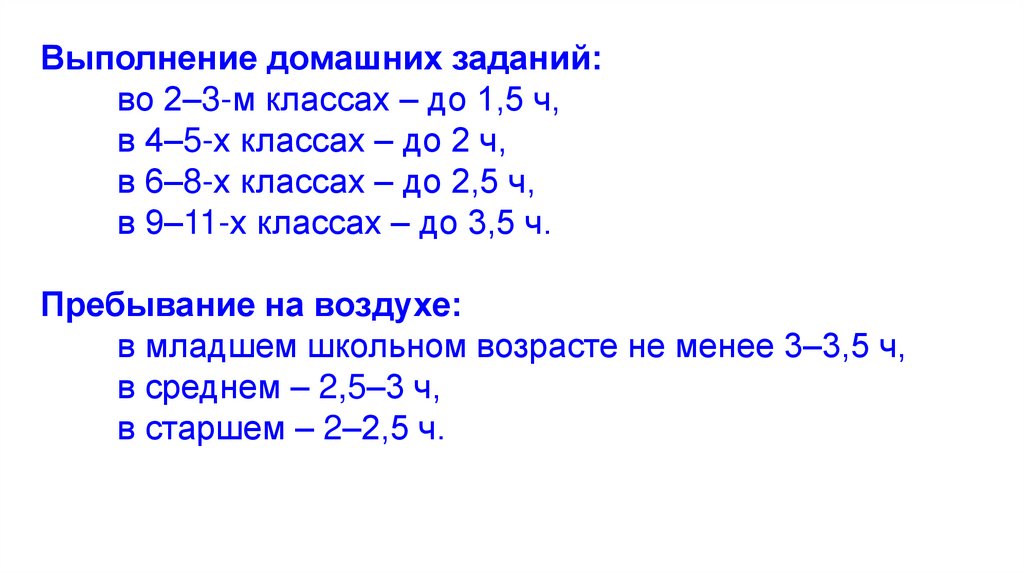 Выполнение домашних заданий:во 2–3-м классах – до 1,5 ч,