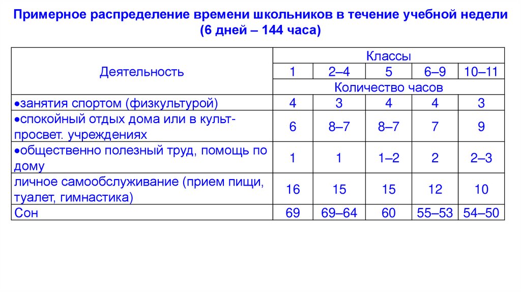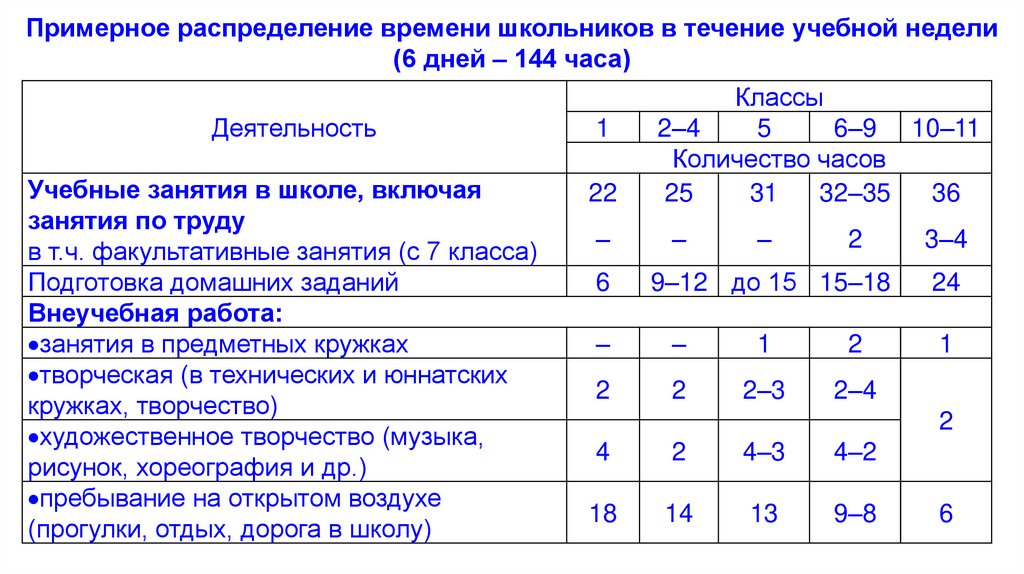 Примерное распределение времени школьников в течение учебной недели(6 дней – 144 часа)