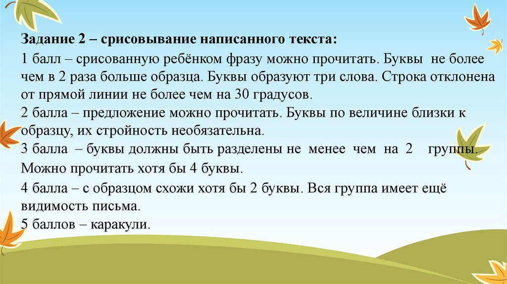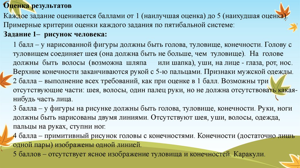 5 баллов – отсутствует ясное изображение туловища и конечностей. Каракули.