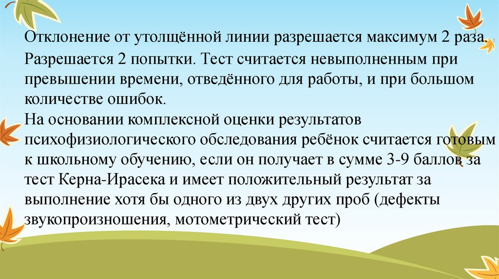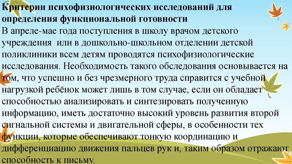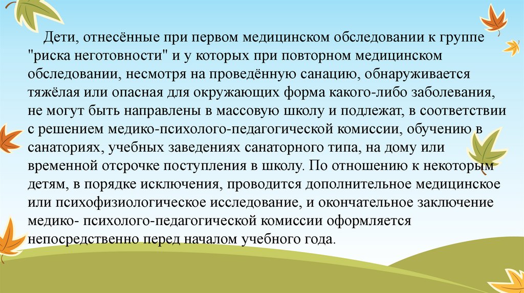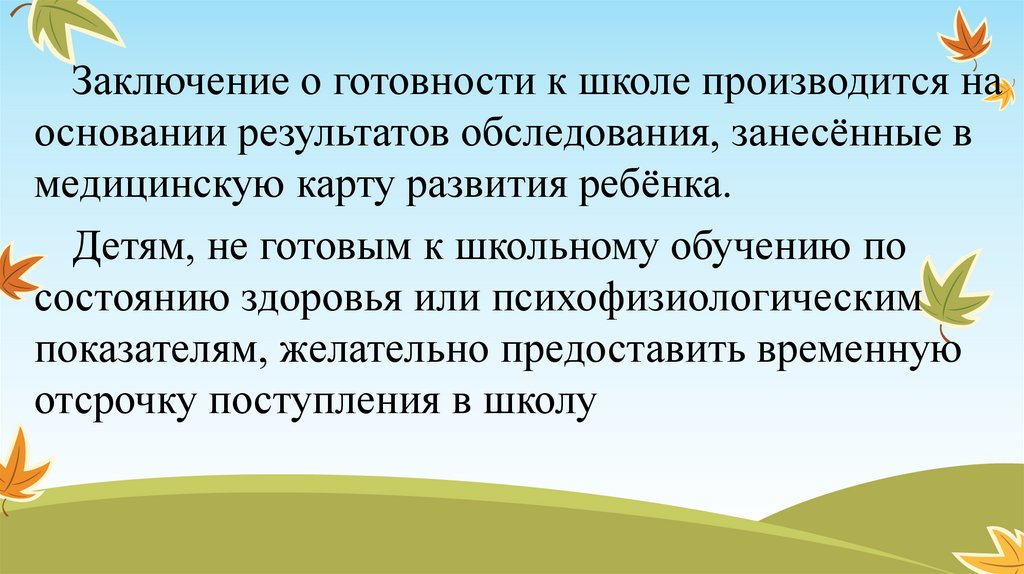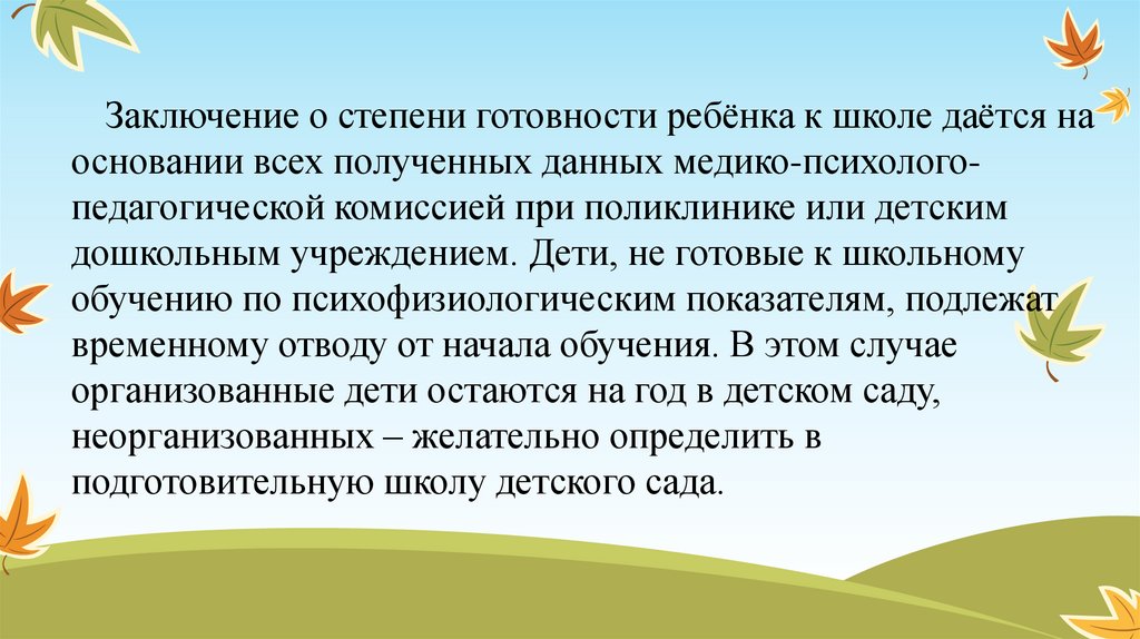 Заключение о степени готовности ребёнка к школе даётся наосновании всех полученных данных медико-психологопедагогической комиссией при поликлинике или детским