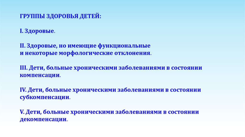 ГРУППЫ ЗДОРОВЬЯ ДЕТЕЙ:I. Здоровые.