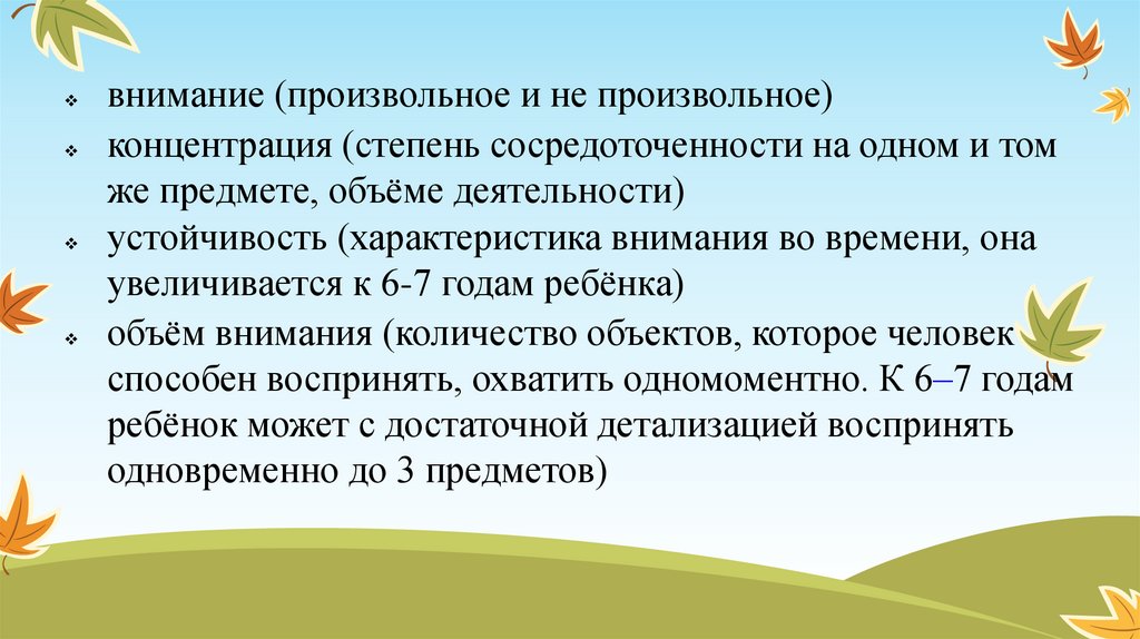 внимание (произвольное и не произвольное)концентрация (степень сосредоточенности на одном и том