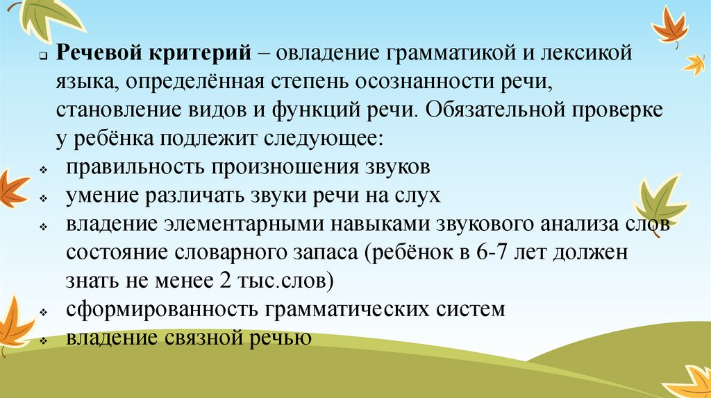 Речевой критерий – овладение грамматикой и лексикойязыка, определённая степень осознанности речи,