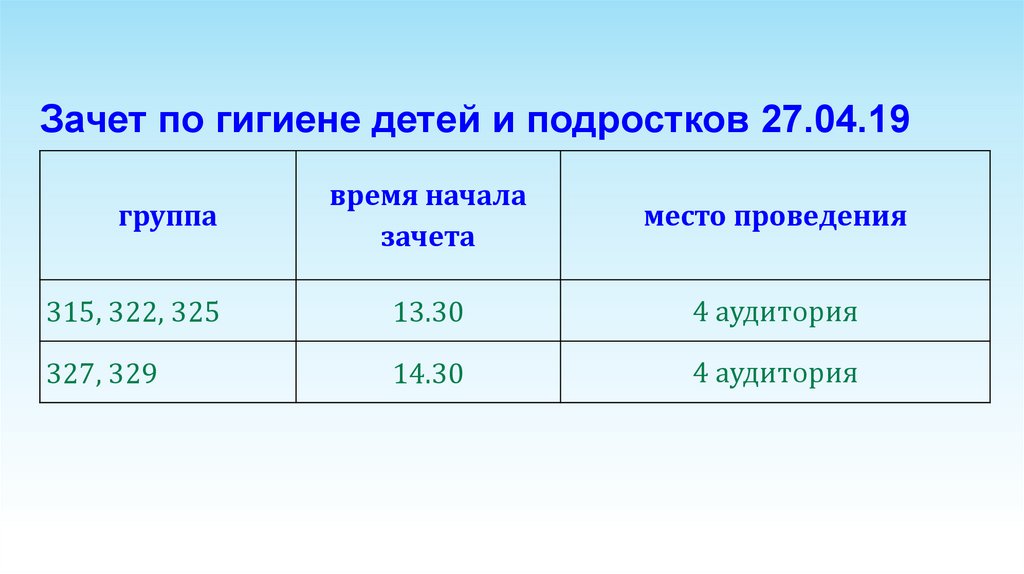 Зачет по гигиене детей и подростков 27.04.19время начала